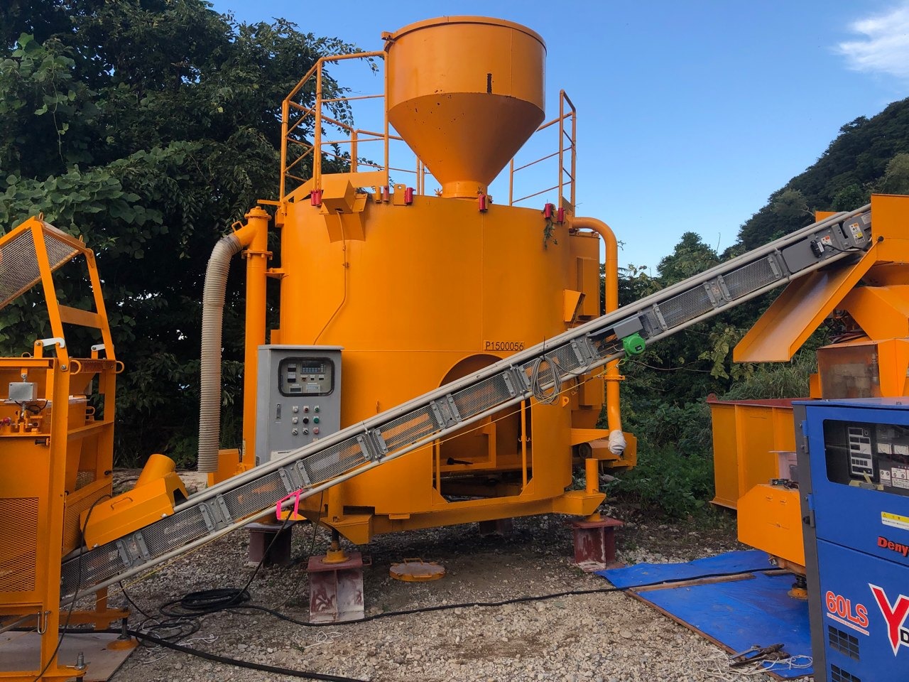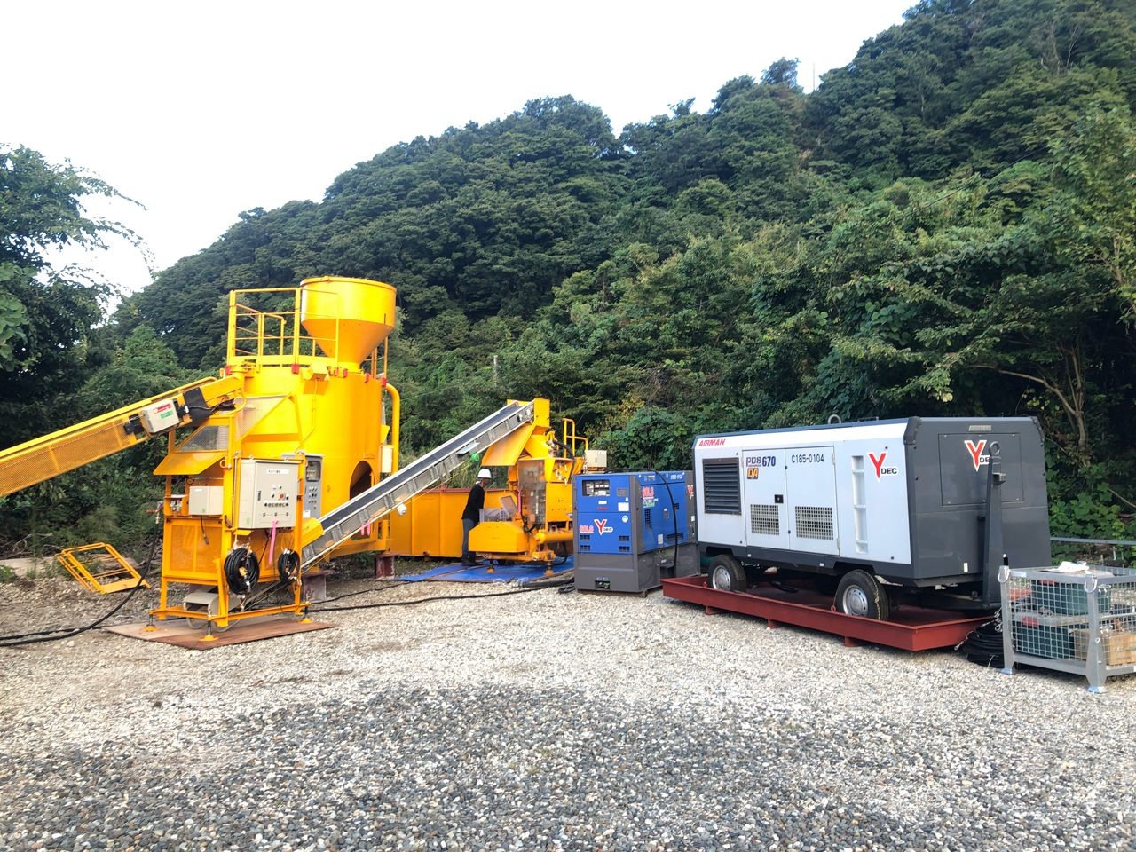 吹付枠工の作業にて使用する吹付プラントの設置が完了しました。